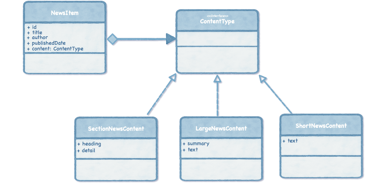 Weaver realized that putting content directly inside NewsItem was breaking the is-a relationship. The base class could not represent the different content shapes used by various news types, so it shouldn’t try to define them. To solve this, he introduced a dedicated content model. Now, each news type has a content object, but the actual content type is chosen independently by each format: