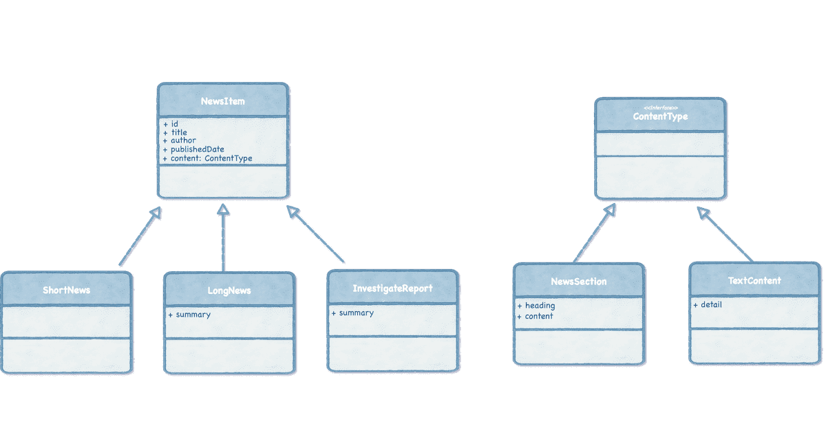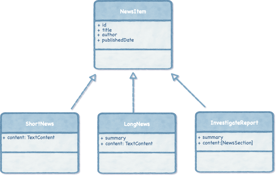 At that point, the hierarchy itself became unnecessary. All articles shared the same identity and behavior, and only their content varied. The model was simplified into a single, stable NewsItem that owned its metadata and delegated all variation to composable content types.